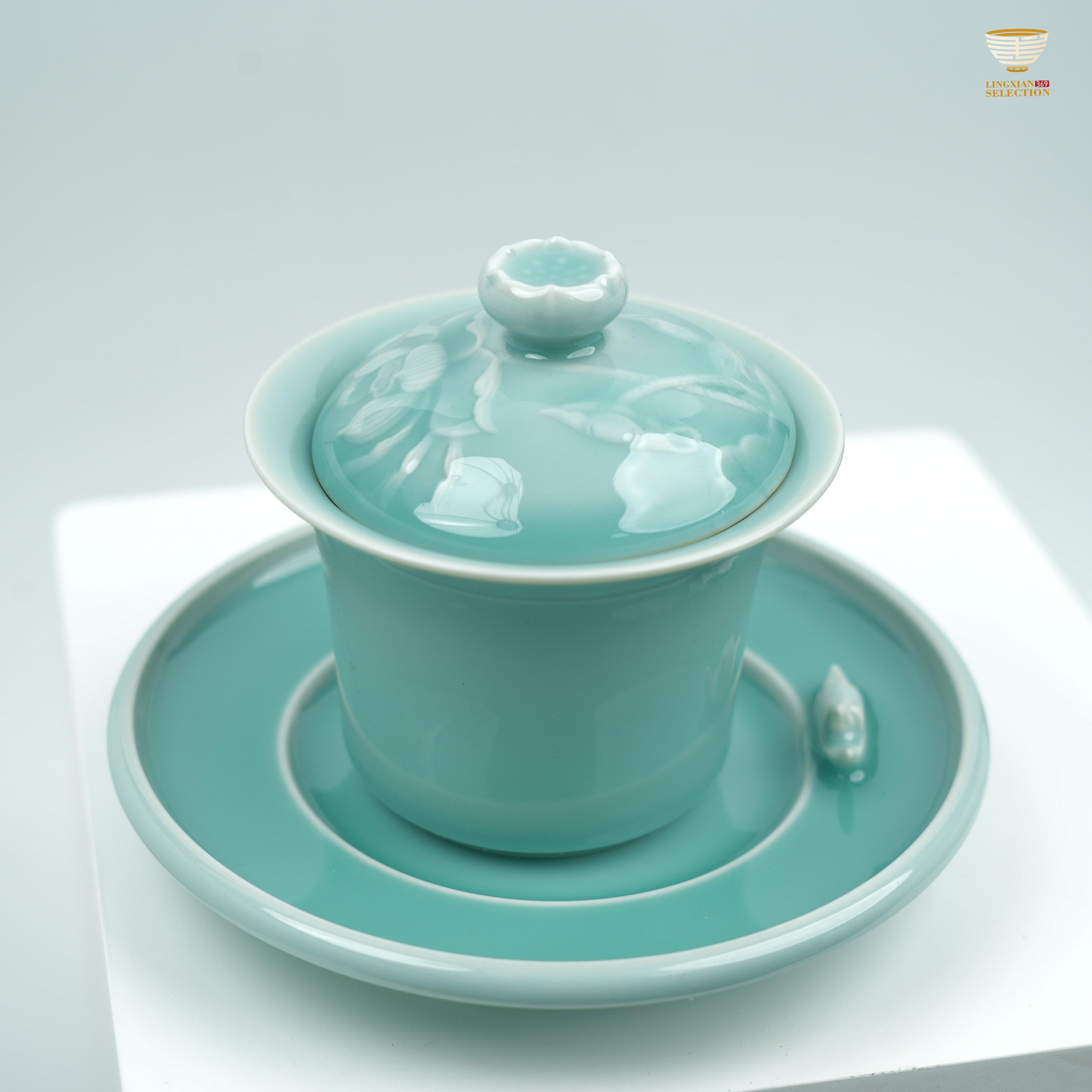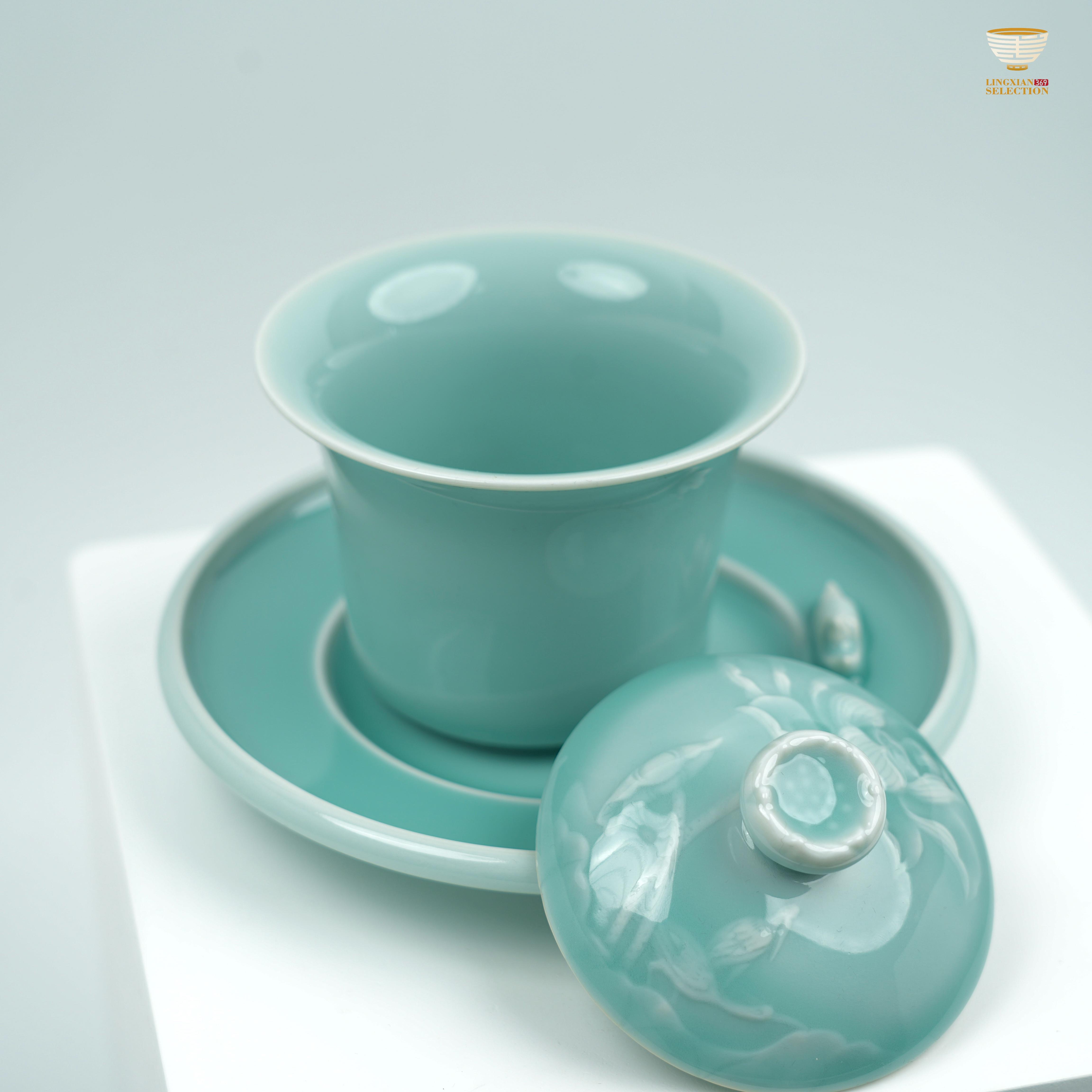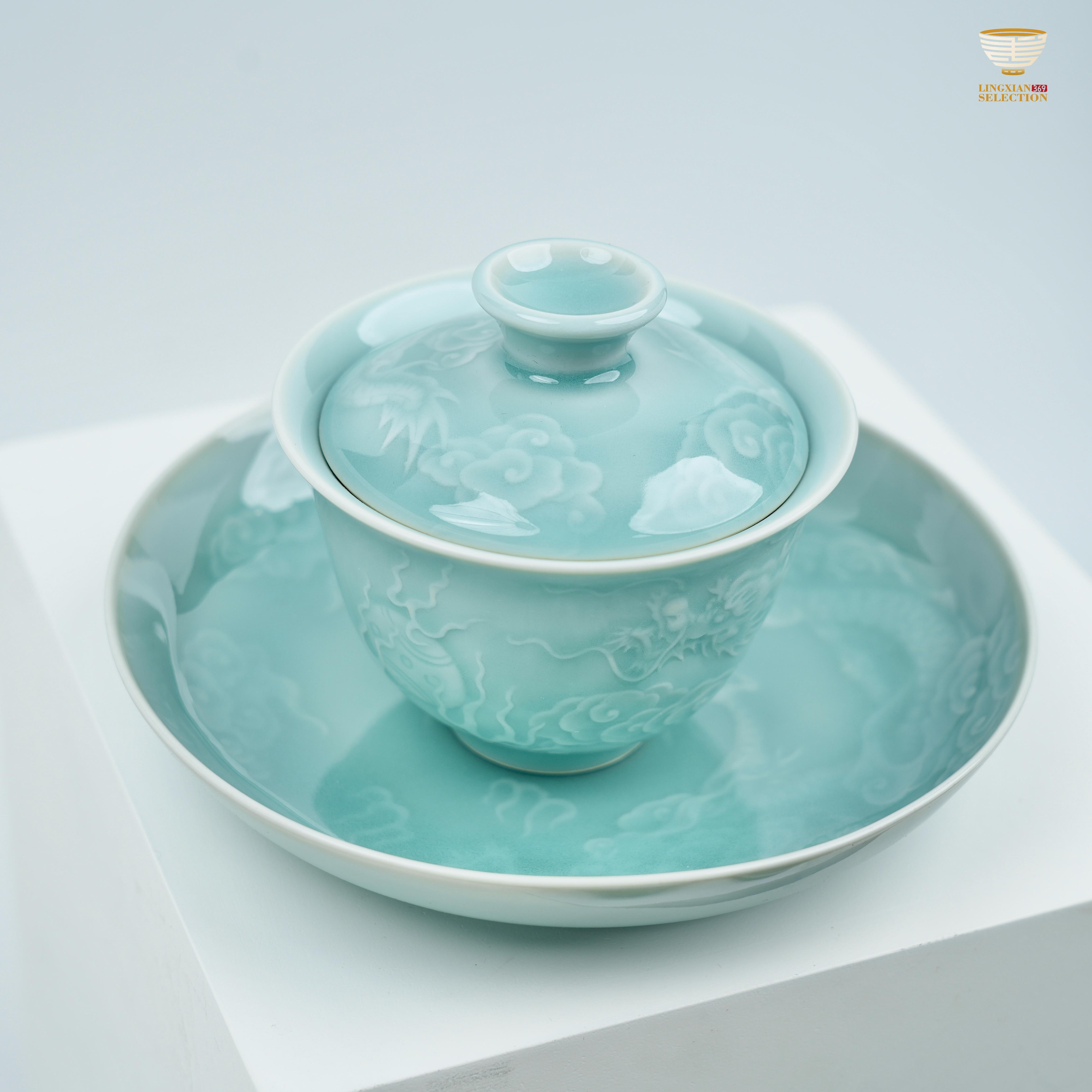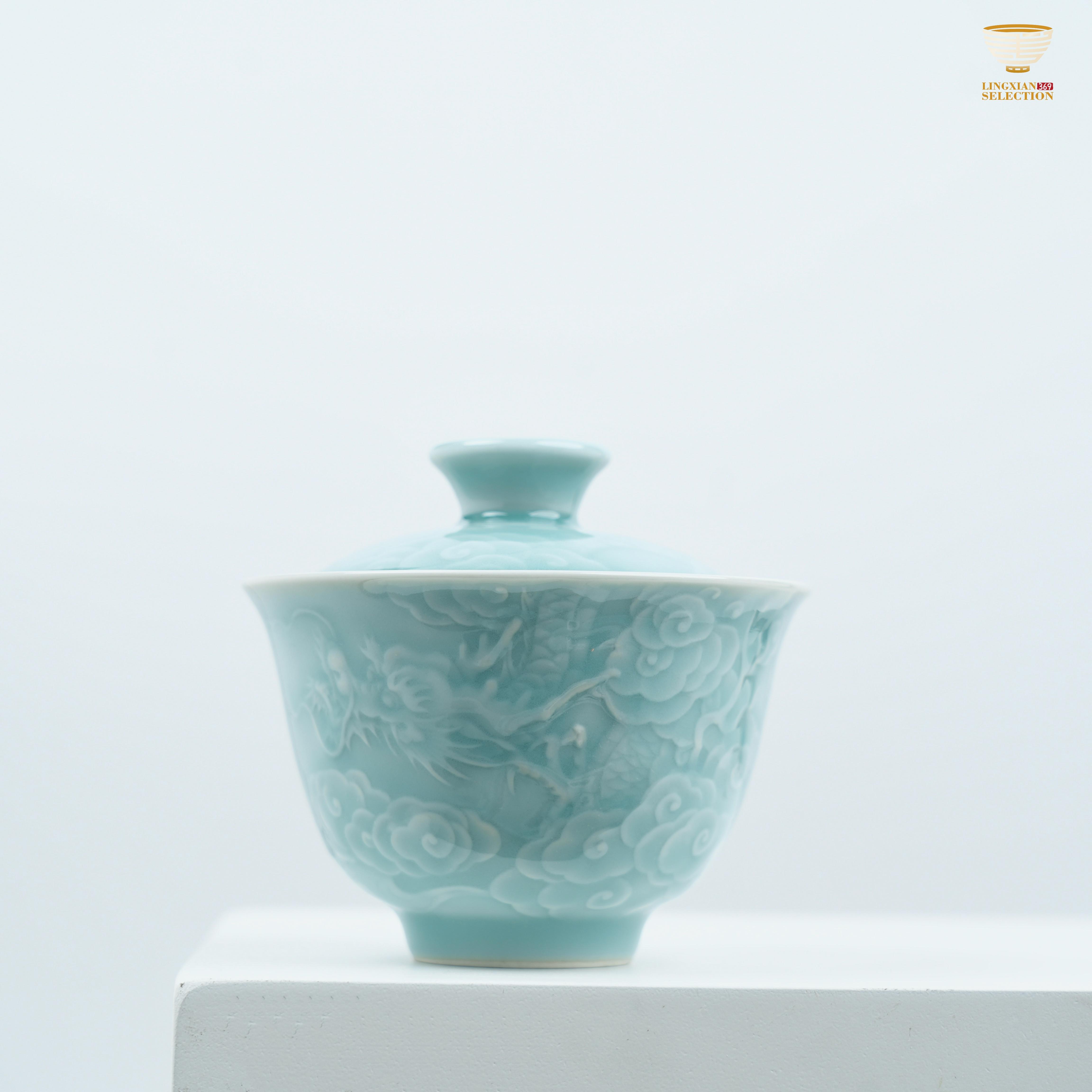 【Celadon Gaiwan From Master Lei Huixian】 – Handcrafted High-Fired Porcelain Lid Bowl with Embossed Dragon | Original Kung Fu Teaware Design