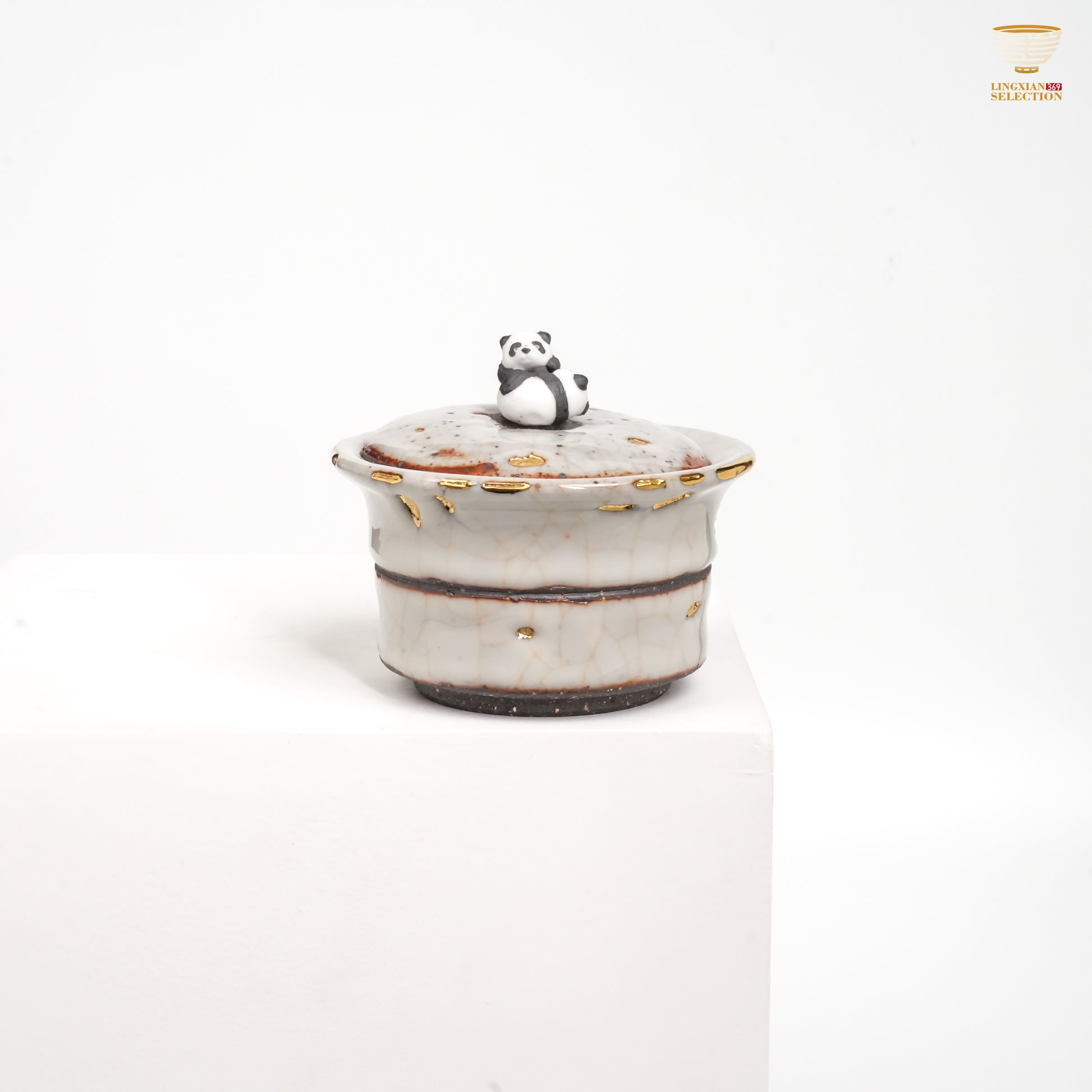 Gao Yue · Shino Ware Panda Bamboo-Form Gaiwan | Handmade Ceramic with Crackle Glaze & Gold Accents | Collectible Oriental Teaware Gift