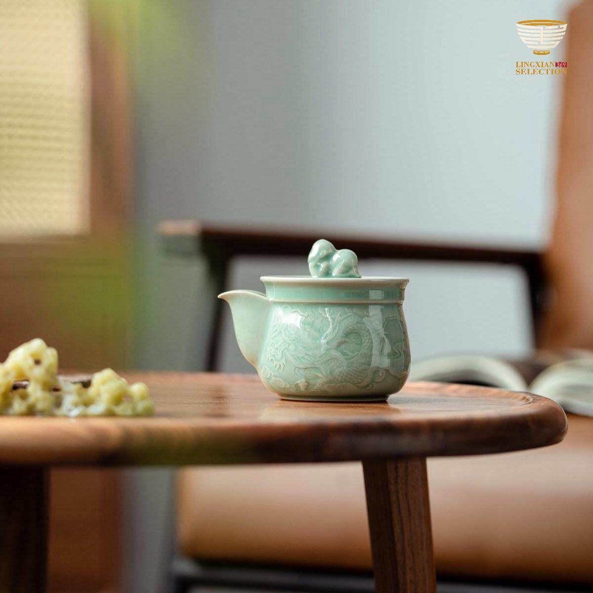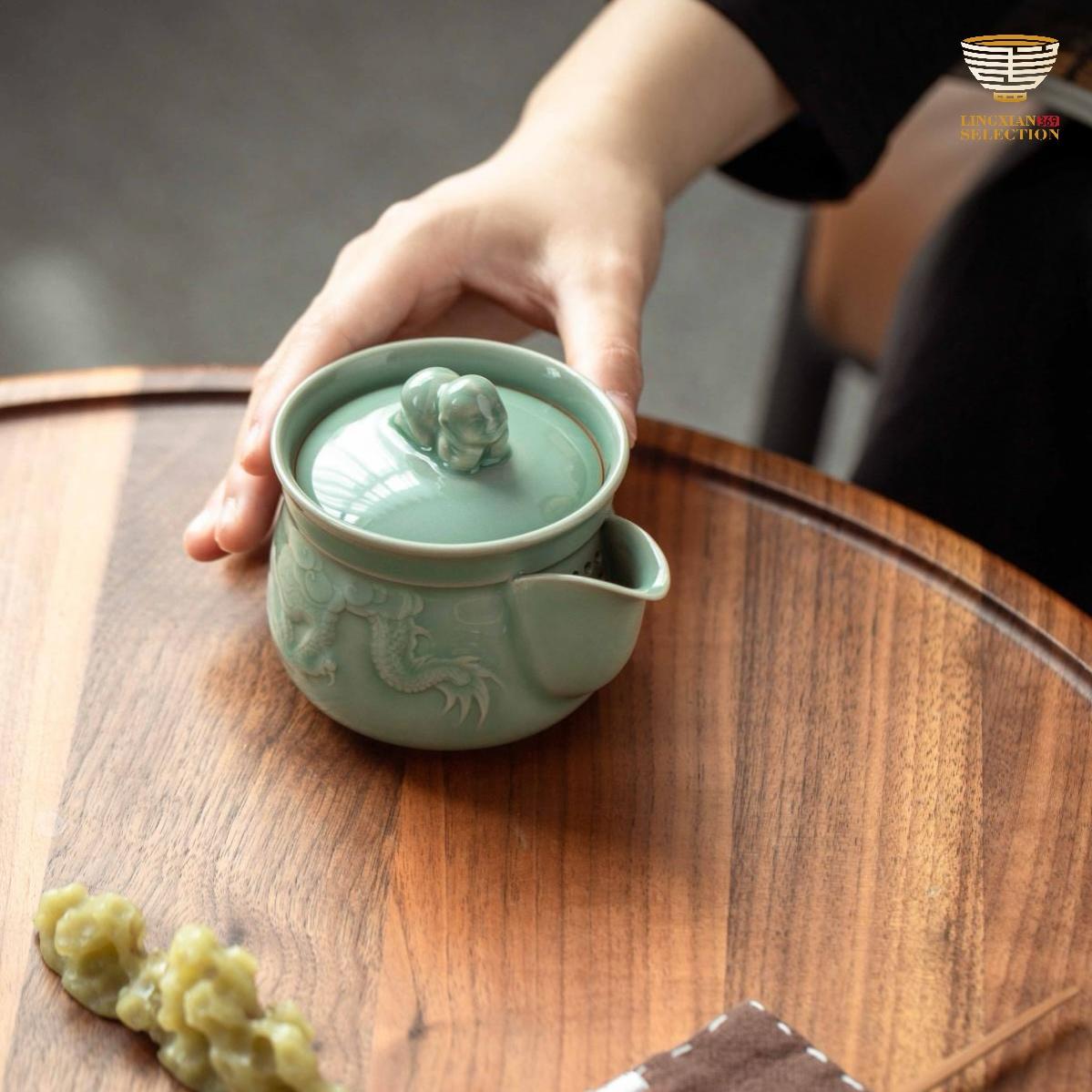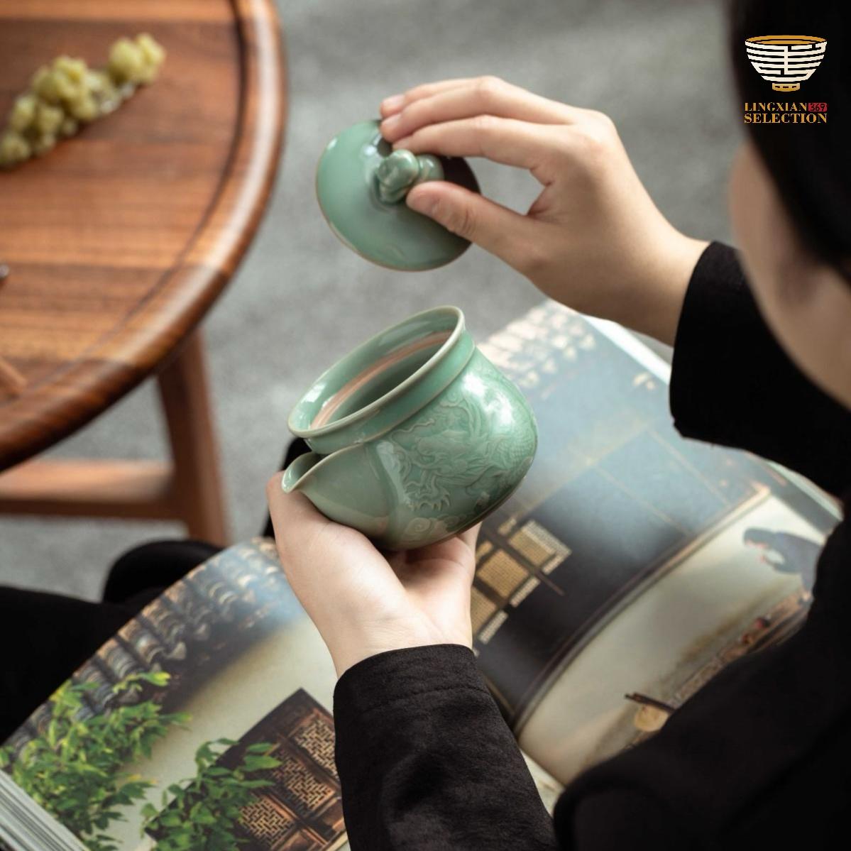 Each piece undergoes over 20 meticulous steps — from kneading the clay, throwing on the wheel, trimming and shaping, to carving and glazing — all strictly following ancient methods. A distinctive feature lies in the double firing process: first a bisque firing, then a glaze firing in wood-fired dragon kilns at temperatures exceeding 1300°C. Natural mineral glazes produce iconic celadon colors such as "Fenqing" and "Meiziqing," resulting in finishes that are smooth as jade and glossy as a mirror.