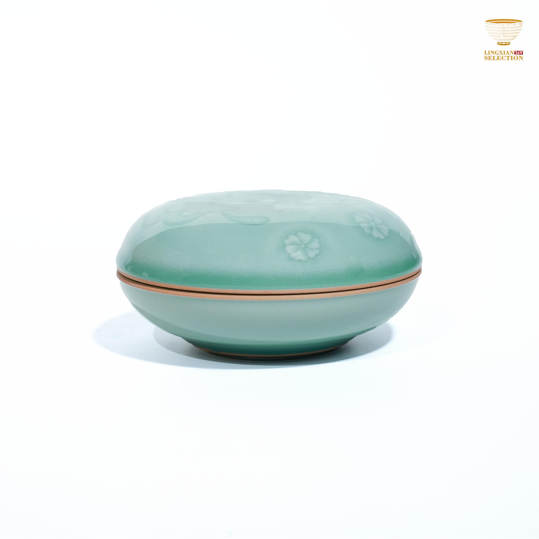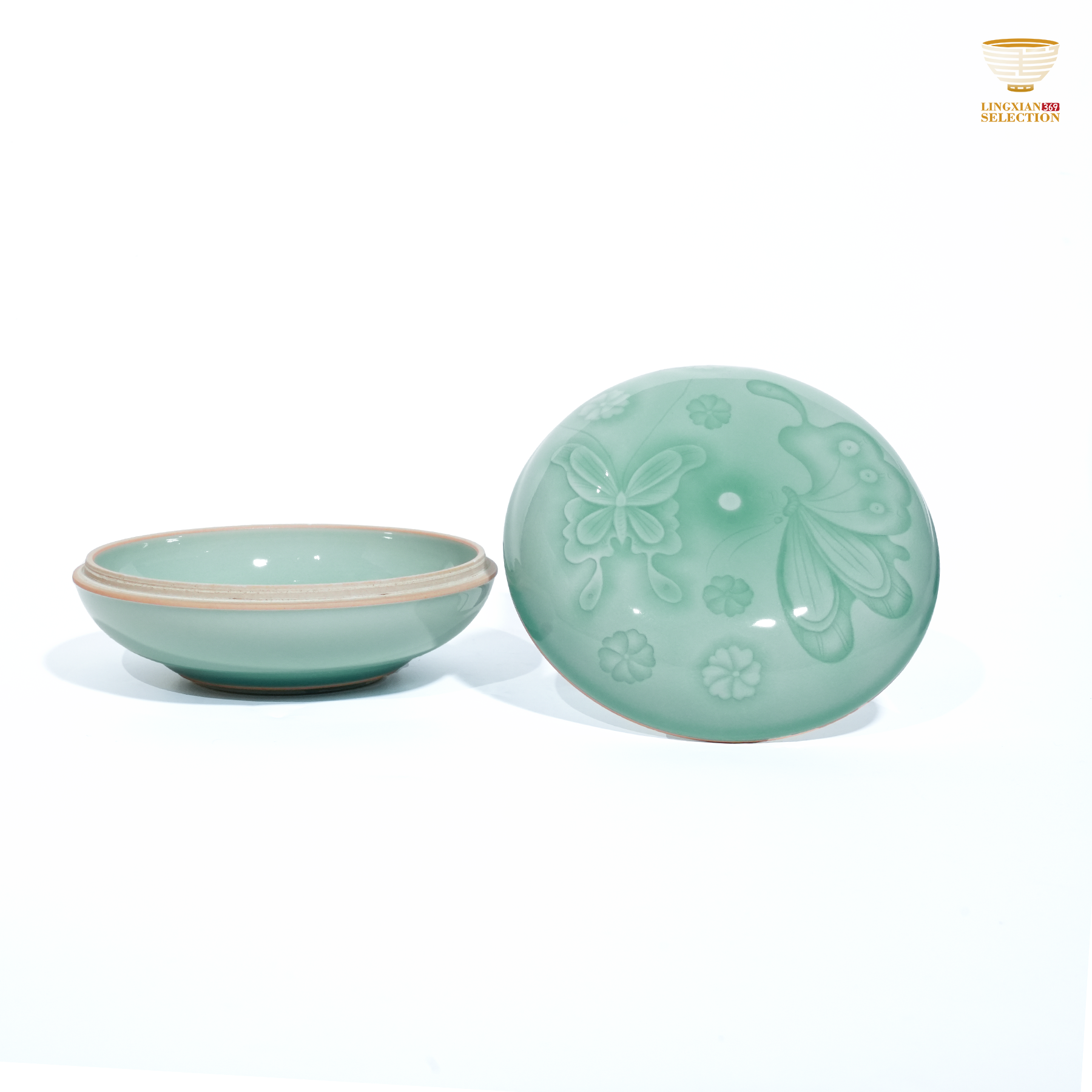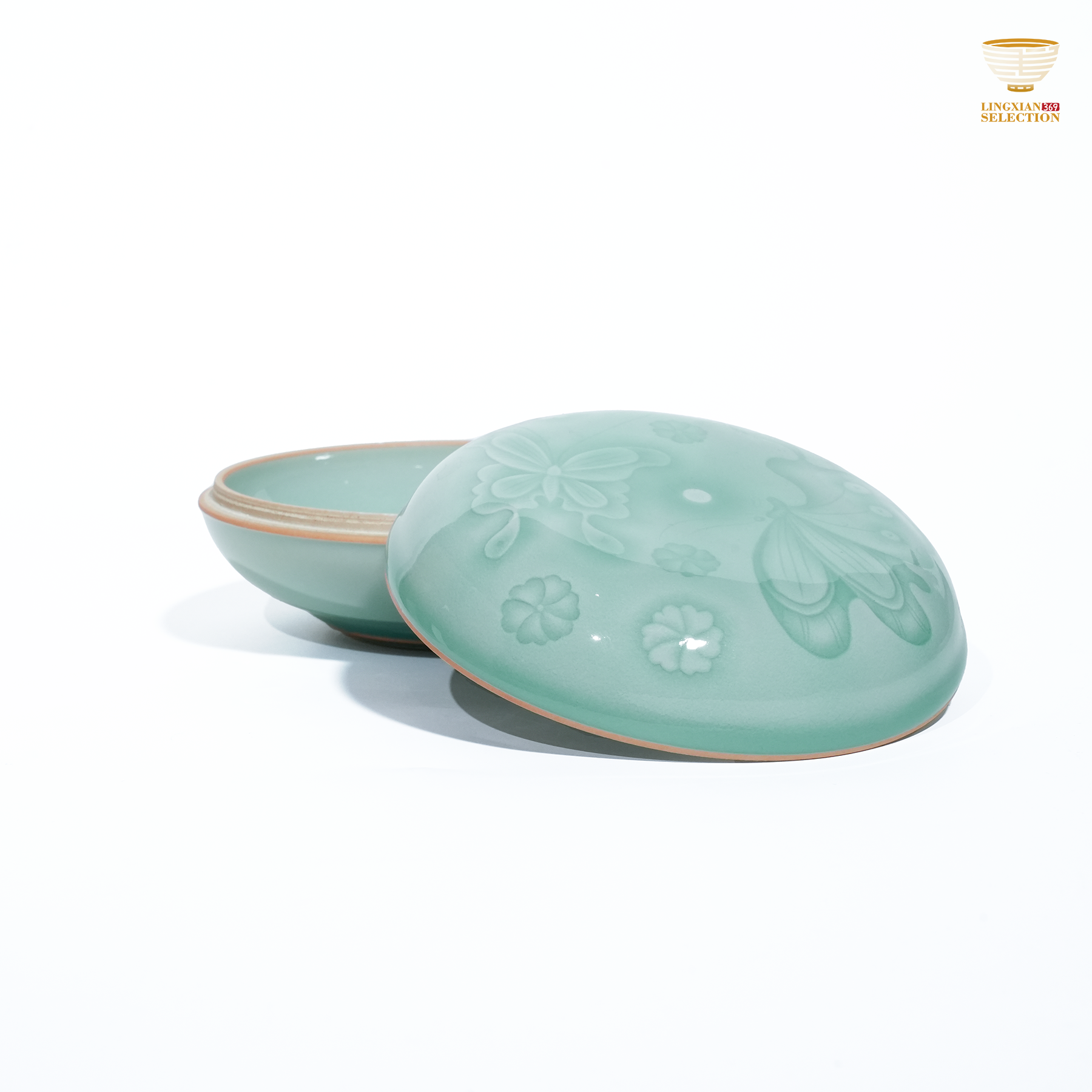 Liao Xinliang Butterfly Pattern Powder Box | Celadon Art Jewelry Storage Box | Handcrafted Porcelain with Floral & Butterfly Design | Elegant Oriental Gift