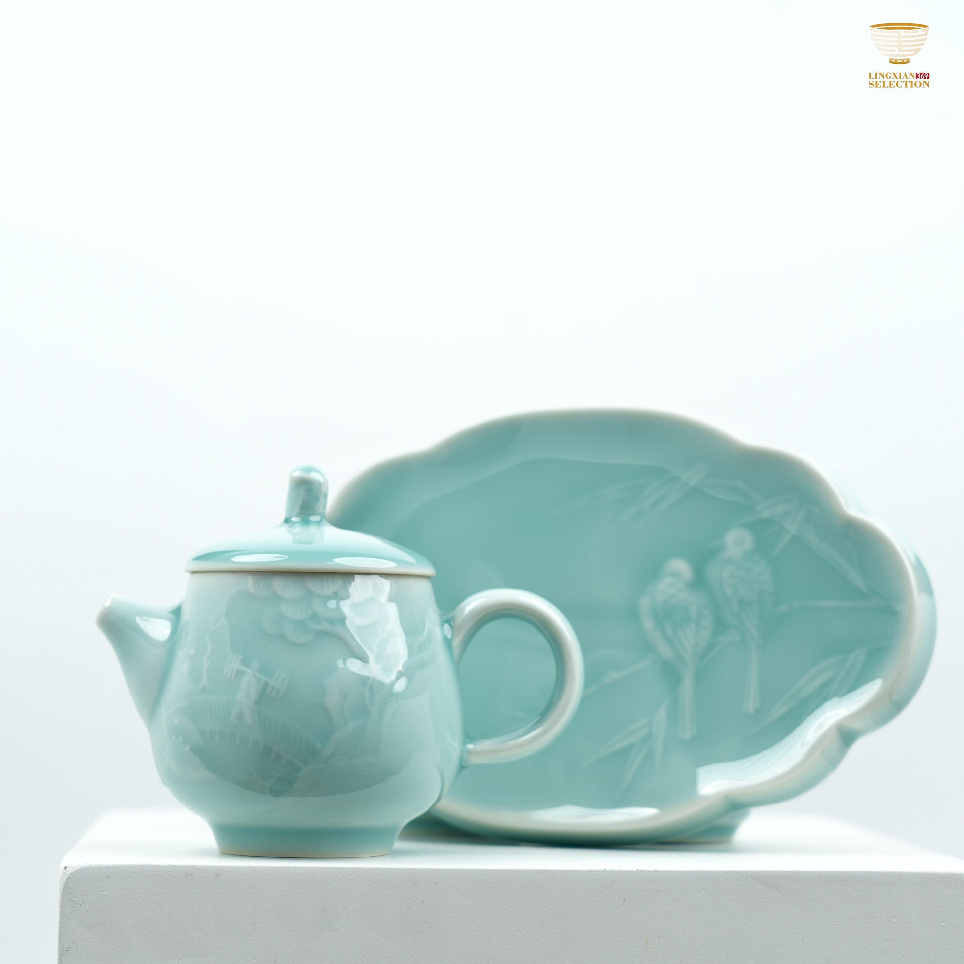 【Premium Celadon landscape Tea Set From Lei Huixian】 – Handcrafted Floral Engraved Teapot & Cups with Lotus Tray | Master Design Collectible Teaware for Gifting