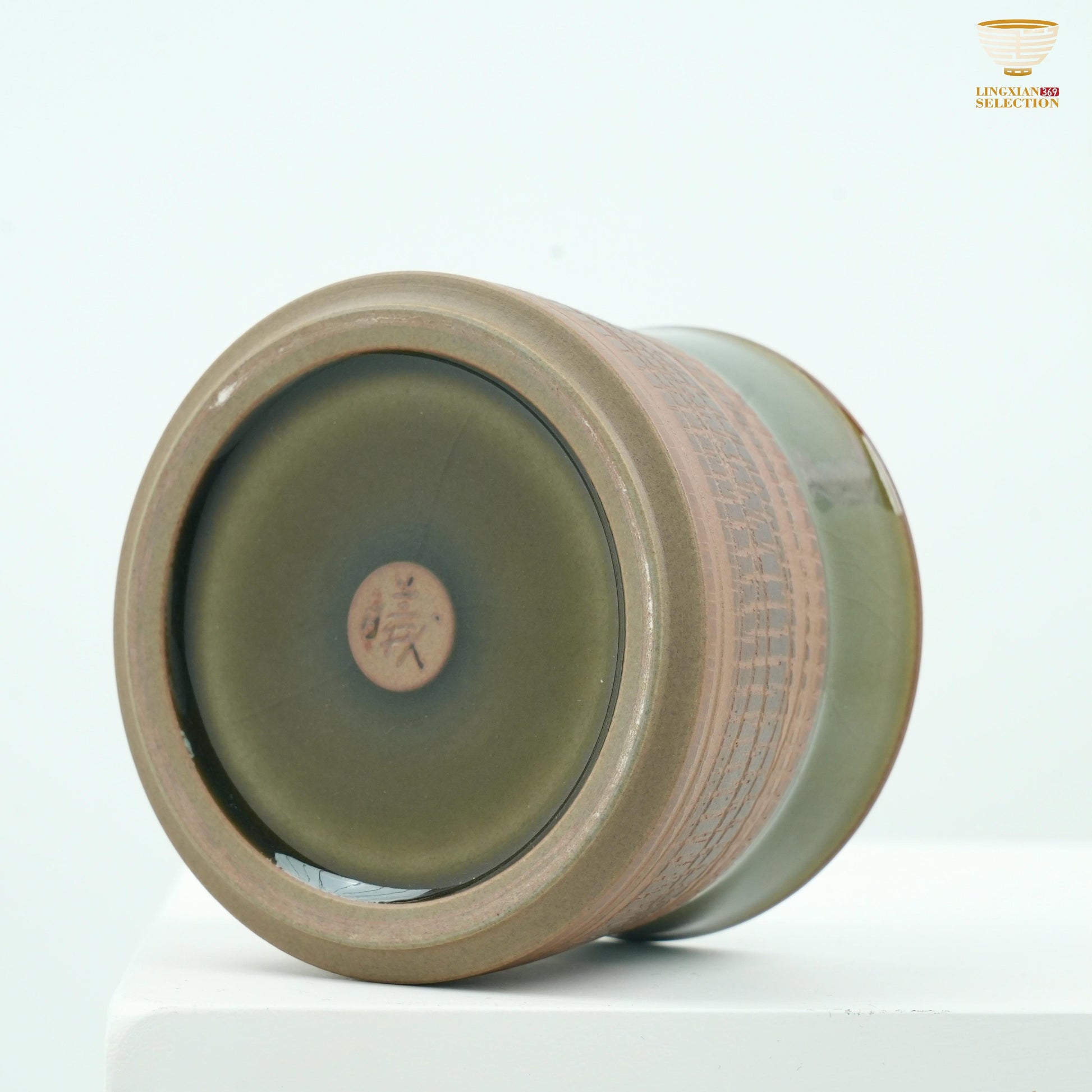 【Wood-fired Celadon Cup From Ye Chenxi】Celadon Tall-Footed Teacup|Vintage Geometric Pattern|Dual Ring Handles|Handcrafted Antiqued Design|Artisan Collectible Teaware|For Ceramic Art Collectors